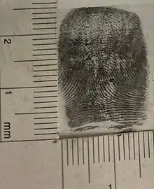 Fingerprint powders are fine powders used, in conjunction with fingerprint brushes, by crime scene investigators and other law enforcement personnel to search for and enhance latent/invisible fingerprints that can be used to determine identification.[1][2] This method of fingerprint development commonly referred to as dusting for fingerprints, involves the adherence of the powder particles to the moisture and sweat secretions deposited on to surfaces by the raised ridges on fingers, palms, or soles of feet designed for grip, called friction ridges.[1][2][3]