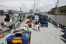 In addition to environmental duties, Louhi can also be used as a support ship for underwater operations by the Finnish Navy. The vessel has facilities for divers, a moon pool and remotely operated underwater vehicles (ROVs), and it can be used to lay and recover submarine communications cable which is stored in the ship's recovery tanks. During crisis time the ship, capable of carrying 1,000 tons of fuel and 100 tons of cargo, can be armed with one 40 mm main gun, two 12.7 mm machine guns and naval mines,[15] and used to supply island forts and other naval vessels.[3]