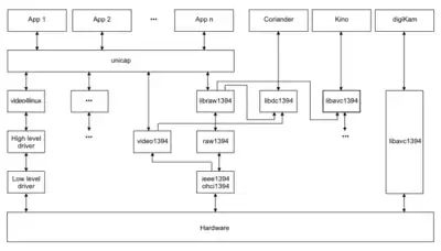 Video cameras are accessed by various APIs. The image to the right depicts the access of the video editing software Kino to the libavc1394 API. Kino also accesses other APIs which are not shown in the image to simplify matters.