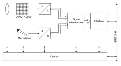 Since the function of a FireWire camera depends upon electrical signals, the module "signal capture" transforms the incident light, as well as the incident sound into electrons. In the case of light, this process is performed by a CCD or CMOS chip. The transformation of the sound is performed by a microphone.