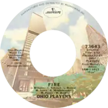 "Fire" is a song by R&B/funk band Ohio Players. The song was the opening track from the album of the same name and hit No. 1 on both the Billboard Hot 100 and the Hot Soul Singles chart in early 1975.[2] It spent two weeks atop the soul chart. "Fire" was the Ohio Players' only entry on the new disco/dance chart, where it peaked at No. 10.[3] The song is considered to be the band's signature song along with "Love Rollercoaster".