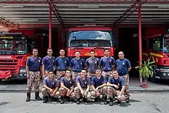 The Volunteer Fire and Rescue Force train regularly in district fire stations so that they and their equipment are in good shape for fire emergencies.[7] The volunteers can be easily identified by their yellow Firefighting Operations Dress.