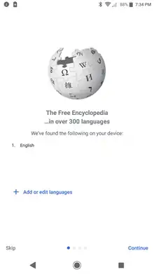 FTUE interface of the Wikipedia Android app. The screen will not appear on subsequent uses of the app unless the app data is cleared.