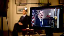 In his first week he also established a policy of producing a weekly Saturday morning video address available on Whitehouse.gov and YouTube,[116][117][118] much like those released during his transition period.[119][120] The first address had been viewed by 600,000 YouTube viewers by the next afternoon.[121] The policy is likened to Franklin Delano Roosevelt's fireside chats and George W. Bush's weekly radio addresses.[120][121]