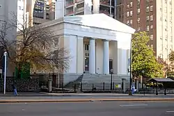 The church moved from its original location in 1841 to E Broad St. at 12th St. Their new building was designed by architect Thomas U. Walter. It is a stuccoed temple-form Greek Revival style building with the two fluted Doric order columns of its portico in antis. During the American Civil War the church building served as an emergency hospital for Confederate Army soldiers. In 1938, the congregation sold the church to the Medical College of Virginia.[3] Also in 1841, a group of members formed the First African Baptist Church. The original First Baptist Church had a mixed congregation. In 1841 they separated. The First African Baptist Church occupied and purchased the original church building at E Broad St. and 14th St. (now College St.) . This building was torn down in 1876 and replaced with the one that stands in that location today.