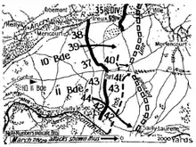 The 11th Brigade's advanced elements subsequently stepped off around 5:45 pm, with several patrols of South Australians from the 43rd Battalion being pushed forward with a view to taking Sailly-Laurette. Coming under intense fire, this patrol was able to slowly work its way forward over the course of just over an hour, and began establishing a line of outposts, but these were well short of the objective. The 42nd Battalion, a Queensland-recruited unit, also established several posts opposite the village.[20] As dusk fell, the 39th Battalion moved north around the 40th and pushed the line forward on the Australian left, to conform with the 40th, and began to dig-in. Shortly afterwards, the 41st belatedly moved up on the 40th Battalion's right to join the line between the 40th Battalion and the outposts established by the 42nd and 43rd Battalions, thus establishing a contiguous line between the Ancre and the Somme.[21]