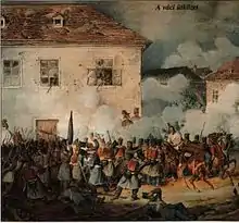 At that moment the imperial officer who was ordering the volleys was so astonished by this recklessness that he forgot to tell his soldiers to shoot, and profiting from this opportunity, the men of the 9th battalions attack, led, this time on foot,[10] by the same Földváry, and their captain Pál Kiss, and in a harsh bayonet fight, they swept away the Austrian resistance.[23] After that the other Hungarian battalions also crossed the bridge, and in heavy street fighting, as a result of which captain Friedrich Brandenstein the commander of the 12. kaiserjäger battalion fell prisoner, and captain Ferdinand Billinek, the commander of the 3/LXIIII battalion was wounded, and pushed the imperials into the streets of the city.[25] Despite the fact that the 1. battalion of the 1/XV Austrian battalion from the reserve came to the aid of the retreating two battalions, they could not stop the Hungarian advance.[26] At the same time, the Austrian were pushed back also at the railroad embankment, so they were forced to continue their resistance inside the city.[10] During this street fighting the Hungarians reached the building of the military boarding school where the wounded Götz lay, defended by the Bianchi infantry regiment. The Hungarians occupied it after heavy fighting, and found the Austrian commander inside, taking him prisoner along with many enemy soldiers.[22] The imperial troops which fought by the railway embankment withstood for an hour after the Hungarians crossed the bridge, preventing an encirclement of the imperial troops from the east, then they also retreated in heavy fighting.[11]