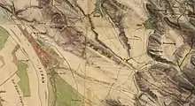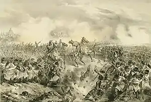 Unaware of the fact that the Bobich brigade lost its way, around 3 p.m. Damjanich was still waiting for the signal from them (a cannon shot), showing that they reached the Naszály mountain behind Vác, in order to start the attack. He sent his troops to approach 1500 paces from the enemy lines, but he still did not gave the order to attack, waiting for Bobich's gun shot.[21] In the same time his troops, which waited for four hours in the pouring rain, started to run out of patience, as well as Damjanich, who finally ordered Wysocki's Polish Legion to charge the bridge, while his artillery fired incessantly.[22] Because the retreat of Jablonowski's brigade, the Austrian cannons stopped to fire for a while, which made the Hungarian artillerymen to realize the enemies real intentions, so they concentrated their shootings on the stone bridge.[21] Götz saw his troops start to retreat from in front of the bridge because of the huge pressure from the Hungarians. He rode forward, yelling: "Advance, do not retreat!" In that moment he was hit by a shell splinter in his forehead, while his horse was taken down by at least ten bullets.[lower-alpha 1] The Austrian soldiers caught him as he fell, and took their wounded commander to the military boarding school in Vác.[22]