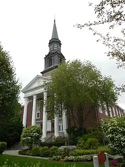 The former First Church of Christ, Scientist, built in 1940, is an historic Christian Science church building located at 391 Walnut Street on the corner of Otis Street in the village of Newtonville, in Newton, Massachusetts. It was designed in the redbrick Colonial Revival style by Densmore, LeClear and Robbins, architects. Due to cost constraints, its steeple was added later.[1] In September, 2004, the church sold its building for $1,050,000 to be converted into apartments.[2] The church in 2007 held services in rented rooms at 300 Walnut Street in the Masonic Building.,[3] but is now meeting at 1141 Walnut Street, in Newton Highlands. The building has since been divided into 11 condominium units.[4] It is now called the Oxford House,[5][6] and was the city's first inclusionary zoning project.[7]