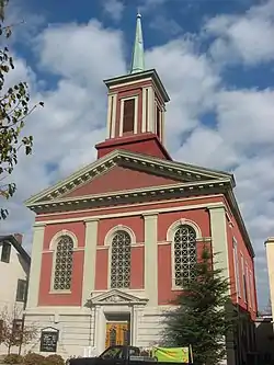 Aurora First United Methodist Church, also known as the First United Methodist Church of Aurora and Aurora Methodist Episcopal Church, is a historic Methodist church located at 304 Third Street in Aurora, Dearborn County, Indiana. It was built between about 1855 and 1862, and is a two-story, gable front, Greek Revival style brick building. It measures 45 feet, 6 inches, wide and 95 feet deep. A limestone front was added to the original building in 1903 and one-story rear addition built between 1885 and 1888. The church was remodeled in 1954.[2]: 5