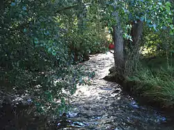 The Fischbach[3] begins at the confluence of the right-hand Glasbach,[4] also called the Vorderbach, and the left-hand Eschbach[5] which, in turn, is formed by the left-hand Hinterbach and right-hand Reutenbach and then collects the Mittelbach, in the village of Fischbach which belongs to the municipality of Niedereschach. The longer and bigger Glasbach is seen as the main headstream. Hydrographically this may even be considered the main source of the River Neckar, because the Fischbach has a higher streamflow than the Badische Eschach which, in turn, is the larger of the two headstreams, and the Badische Eschach is more powerful than and longer than the young Neckar at their confluence. The Fischbach flows in a southeasterly direction and merges with the Baden Eschach near Niedereschach. According to traditional sources the stream from here to Horgen is called the (Badische) Eschach, but current sources see the more powerful and longer Fischbach as continuing to Horgen where, as the bigger but shorter tributary, it empties into the longer Württemberg Eschach (Württembergische Eschach), which nowadays is just called the Eschach without any qualifier.