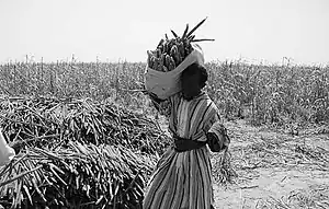 Agriculture is one of the dominant parts of Senegal's economy, even though Senegal lies within the drought-prone Sahel region. As only about 5% of the land is irrigated, Senegal continues to rely on rain-fed agriculture. Agriculture occupies about 75% of the workforce. Despite a relatively wide variety of agricultural production, the majority of farmers produce for subsistence needs. Millet, rice, corn, and sorghum are the primary food crops grown in Senegal. Production is subject to drought and threats of pests such as locusts, birds, fruit flies, and white flies.[1] Moreover, the effects of climate change in Senegal are expected to severely harm the agricultural economy due to extreme weather such as drought, as well as increased temperatures.[2]