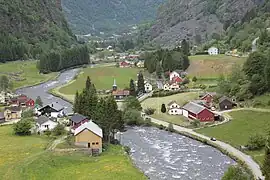 ![]() View of the village of Flåm and the Aurlandsfjorden at the north end of the valley. | |