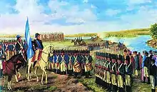 - ↑ Spanish: Soldados de la Patria, en este punto hemos tenido la gloria de vestir la escarapela nacional; en aquél (señalando la batería Independencia) nuestras armas aumentarán sus glorias. Juremos vencer a nuestros enemigos interiores y exteriores y la América del Sud será el templo de la Independencia y de la Libertad. En fe de que así lo juráis decid conmigo: ¡Viva la Patria!" "Señor capitán y tropa destinada por la primera vez a la batería Independencia: id, posesionaos de ella y cumplid el juramento que acabáis de hacer. Proclama dirigida por M. Belgrano a su ejército al enarbolar por primera vez la bandera