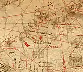 The white flag with the single red St. George's cross was supposedly used by King Vakhtang I in the 5th century.[10] According to tradition, King Tamar (d. 1213) used a flag with a dark red cross and a star in a white field.[11] In the 1367 map by Domenico and Francesco Pizzigano, the flag of Tifilis (Tbilisi) is shown as a Jerusalem cross (a large cross with smaller crosses in each quarter). According to D. Kldiashvili (1997), the Jerusalem cross might have been adopted during the reign of King George V.[12]