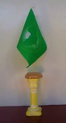 | Design | A dark green map of the African continent, plus the Sinai Peninsula and offshore islands, on a white sun, surrounded by a circle of 55 5-pointed gold (yellow) stars, on a dark green field. |