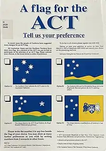 In 1993, following a 1992 motion by Opposition leader Trevor Kaine, the ACT Government commenced a process to develop and select an ACT flag.[3] The ACT Government selected four options and surveyed the public between 19 February[4] and 5 March 1993[5] to find the public's preference.