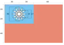 In later years, more details regarding of the canton area (also used as the flag of the KMT), were codified into law. In the drawing released in "Law on the Party and National Flag Manufacturing and Methods" (黨旗國旗之製造及使用辦法), the sun was drawn in more specific detail and mathematical values were given to all elements in the flag. In the law, the canton still had a ratio of 2:3, but the math values given were 24x36 meters. The diameter of the sun with rays is 6⁄8 of height of the canton, so in this case, it will be 18. The diameter of the white sun without the sun rays is 1⁄4 of the width of the canton, so it is 9. The blue ring that is on top of this sun and part of the rays is 1⁄15 diameter of the white sun, so the size will be 0.6. The angle of the rays, 30 degrees, and the total number of rays have not changed.[14]