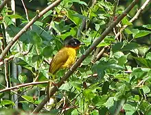 The flame-throated bulbul (Rubigula gularis) is a member of the bulbul family of passerine birds and the state bird of Goa. It is found only in the forests of the Western Ghats in southern India. Formerly included as a subspecies of Pycnonotus flaviventris it has since been elevated to the status of a full species. They are olive-backed with yellow undersides, a triangular orange-red throat and a white iris that stands out against the contrasting black head. They are usually seen foraging in groups in the forest canopy for berries and small insects. They have a call often with two or three tinkling notes that can sound similar to those produced by the red-whiskered bulbul. The species has been referred to in the past by names such as ruby-throated bulbul and black-headed bulbul, but these are ambiguous and could apply to other species such as Rubigula flaviventris and R. dispar.