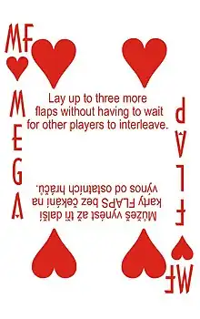 - The 4-rank cards are called "Flaps", and the 4♥ a "Mega-Flap". When a Flap card is laid, anyone can lay Flaps cards in any order, so long as they interleave (i.e. take turns) with the other players. Playing a Mega-Flap allows that player to immediately play up to three more Flaps, without interleaving. When the Flapping is finished, play continues in the same direction, following suit or number as normal.