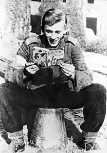 A young corporal of the Home Army reading a Polish edition of one of Flash Gordon ("Błysk Gordon - Królowa Błękitnej Magii") graphic novels during the Warsaw Uprising of 1944