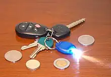 Light output from LED flashlights varies even more widely than for incandescent lights. "Keychain" type lamps operating on button batteries, or lights using a single 5 mm LED, may only produce a few lumens. Even a small LED flashlight operating on an AA cell, but equipped with an LED, can emit 100 lumens. The most powerful LED flashlights produce more than 100,000 lumens and may use multiple LEDs.[14]
