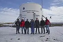 ![]() The completed exterior of the station on July 26, 2000. From left to right are Joe Amarualik, Joannie Pudluk, John Kunz, Frank Schubert, Matt Smola, Bob Nesson, and Robert Zubrin. | |