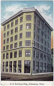 The Hamilton Building also known as The Flatiron Building of Bellingham and the Bellingham Bay Furniture Building was the first "skyscraper" in Bellingham. Built in 1908 for Talifero Simpson Hamilton's growing Bellingham Bay (B.B.) Furniture Company established in 1889, the building cost $100,000 and used thirty-five thousand barrels of cement along with 200,000 pounds of steel. Due to its triangular shape and resemblance to the Fuller Building in New York, the building instantly garnered the flatiron nickname.[1] It was Bellingham's tallest structure until 1926.