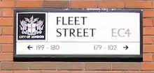 The street runs east from Temple Bar, the boundary between the Cities of London and Westminster, as a continuation of the Strand from Trafalgar Square. It crosses Chancery Lane and Fetter Lane to reach Ludgate Circus by the London Wall. The road ahead is Ludgate Hill. The street numbering runs consecutively from west to east south-side and then east to west north-side.[1] It links the Roman and medieval boundaries of the City after the latter was extended. The section of Fleet Street between Temple Bar and Fetter Lane is part of the A4, a major road running west through London,[1] although it once ran along the entire street and eastwards past St Paul's Churchyard towards Cannon Street.[5]
