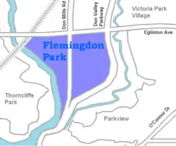 Flemingdon Park (locally Flemo) is a neighbourhood in Toronto, Ontario, Canada, located in the city's North York district. It is part of the Don Valley East federal and provincial electoral districts, and Ward 26: Don Valley East (South) municipally. In 2011, its population was 22,205.[1] The average income was $66,784.[2]