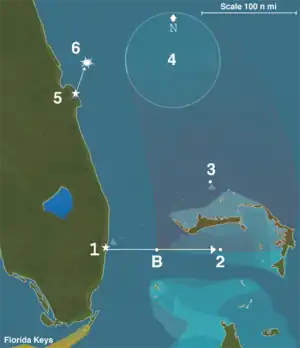 1. Leave NAS Fort Lauderdale 14:10 on heading 091° for 56 nautical miles (104 km), drop bombs at Hens and Chickens shoals (B) until about 15:00 then continue on heading 091° for 67 nautical miles (124 km)