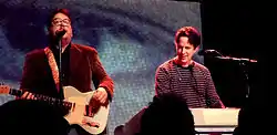 The band continued to tour as a duo, with Linnell playing accordion and Flansburgh on guitars, or occasionally playing a marching band bass drum. Large posters of postage stamps adorned the stage as props; the minimal arrangement was received as a boldly simple choice. Sets included a combination of old and new material.[31] As in the past, the band was backed by a tape deck playing drum tracks or a metronome in lieu of a full rhythm section.[32]