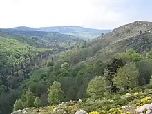 This level is more often forested than the lower level. The characteristic trees at this altitude are the Sessile Oak and the Pedunculate Oak, especially in the west of the massif. In the east, the Scots pine can be found.[3] The flora accompanying these woody species is not particularly remarkable: the classic woodland flowers such as Lily of the Valley, Wood Anemone, common cow-wheat and Solomon's Seal can be found here. Among the slightly less common plants, one might come across the Stinking hellebore or Bear's foot, a plant that is easy to recognize and characteristic of basic soils (especially limestone). Generally speaking, in the nineteenth and twentieth centuries, this level was the subject of massive reforestation, as in the Limousin region (planting of conifers), but also in the south on certain steep slopes which tended to erode (a good example is provided by the black pine forests all around the causses and in particular in the upper Lot valley around Mende).