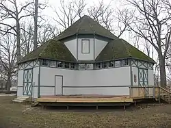 The Floral Hall was constructed in 1884 at the fairgrounds in Bowling Green; it originally held horticultural exhibits, although in the 20th century it was renamed "Needle Hall" after it began hosting needlework exhibitions. In later years, the fair moved to another location, the original grounds were converted into a city park, and all other buildings from the fairgrounds were eventually destroyed. However, the city retained the floral/needle hall, changing it into a picnic shelter and carefully attending to the building's upkeep.[4]
