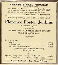 On the other hand, Jenkins refused to open her performances to the general public, and was clearly aware of her detractors. "People may say I can't sing", she once remarked to a friend, "but no one can ever say I didn't sing."[5] She dismissed her original accompanist, Edwin McArthur, after catching him giving her audience "a knowing smile" during a performance.[31] She went to great lengths to control access to her private recitals, which took place at her apartment, in small clubs, and each October at the Verdi Club's annual "Ball of the Silver Skylarks" in the Ritz-Carlton Hotel's Grand Ballroom. Attendance, by personal invitation only, was restricted to her loyal clubwomen and a select few others. Jenkins handled distribution of the coveted tickets herself, carefully excluding strangers, particularly music critics.[13] "There's no way she could not have known", said Schuman. "No one is that unaware ... she loved the audience reaction and she loved singing. But she knew."[27]