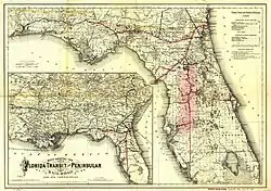 The Florida Railroad was incorporated January 8, 1853, to build a line across the state, from Fernandina, Florida (north of Jacksonville, Florida) southwest to Cedar Key, Florida. The first train ran in 1861, but the line failed and the company was reorganized in 1866. In 1872 it was reorganized again as the Atlantic, Gulf and West India Transit Company. In 1881, Sir Edward Reed purchased the railroad and reorganized it as the Florida Transit Company, which in 1883 was reorganized again as the Florida Transit and Peninsular Railroad. The Florida Transit and Peninsular operated two subsidiaries, the Peninsula Railroad and Tropical Florida Railroad, organized to build lines respectively from the Florida Transit at Waldo, Florida to Ocala, Florida and beyond to Tampa, Florida.[3]