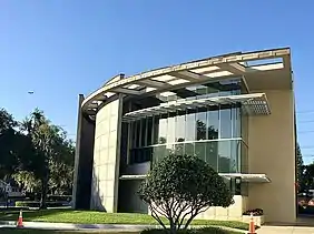 The E.T. Roux library, typically referred to as simply the "Roux Library," is located on the campus of Florida Southern College in Lakeland, FL.[29] Designed by Frank Lloyd Wright for his Child of the Sun campus, the original Roux Library was built between the years of 1941–1945 at the cost of $120,000.[30] The building is circular and housed a multi-tiered reading room in addition to library stacks. In March 1968, the new Roux Library opened in a different location on campus. The new location was designed by Nils Schweizer in a mid-century modern style. Schweitzer was a protege of Frank Lloyd Wright and went on to have a successful architectural career in the state of Florida.[31]