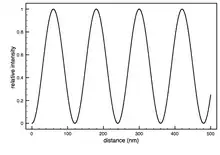 Example of a FLIC intensity plot showing the relative fluorescence intensity measured versus the distance of the fluorophore from the reflective surface. The peaks might not be the same height in a real experimental plot