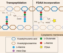 FDAA consists of a D-amino acid and a fluorophore (coupled through the amino acid side chain.) The D-amino acid backbone is required for its incorporation into the bacterial peptidoglycan through the activity of DD-transpeptidases.[3] Once being incorporated, one can use fluorescence-detection techniques to visualize the location of new PG formation as well as the growth rate.[4]
