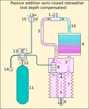 A rebreather retains most of the exhaled gas for re-use and does not discharge it immediately to the surroundings.[3][4] The inert gas and unused oxygen is kept for reuse, and the rebreather adds gas to replace the oxygen that was consumed, and removes the carbon dioxide.[3] Thus, the gas recirculated in the rebreather remains breathable and supports life and the diver needs only to carry a fraction of the gas that would be needed for an open-circuit system. The saving is proportional to the ambient pressure, so is greater for deeper dives, and is particularly significant when expensive mixtures containing helium are used as the inert gas diluent. The rebreather also adds gas to compensate for compression when dive depth increases, and vents gas to prevent overexpansion when depth decreases.[2][5][1]