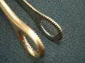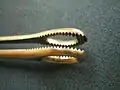 A foerster clamp is a surgical clamp with a round eyelet.[1] Also known as a sponge clamp, or sponge stick. Used for atraumatically grasping lung tissue in thoracic surgery. When grasping a surgical sponge in the jaws, Foerster clamps are commonly used for removing small amounts of fluids from the operative area and applying pressure to sites of bleeding.[1] May also be used for tissue dissection. Invented by David William Foerster of Oklahoma City, Oklahoma, who pioneered sex change operations in the United States.