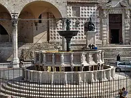 The monumental fountain was designed by Frà Bevignate da Cingoli and built between 1275 and 1277 to celebrate the arrival of water in the acropolis of the city, by means of the new aqueduct. Bevignate cooperated with other talented professionals, as Boninsegna Veneziano, a hydraulic engineer, who accomplished an incredible audacious endeavour, being able to carry the water coming from monte Pacciano, located a few kilometres,[1] without the help of pumps. By means of a forced pressure duct, he managed to give to the water the opposite movement, i.e., the water flowed uphill instead of downhill.[2]