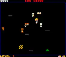 Scattered throughout the screen are piles of food, such as pies, peas, tomatoes, and bananas. Both the player and the chefs can grab food from the piles to throw at each other. The player can grab a piece of food by running over a pile, then throw it by aiming the joystick in a chosen direction and pressing the button. The supplies of most foods are limited, but watermelon is unlimited in supply.[1] Whenever a chef is hit by food thrown by the player or another chef, he is knocked off the screen.[1] The player loses a life if Charley touches a chef, is hit by a chef's thrown food, falls into an open hole, or fails to eat the ice cream before it completely melts.[1]