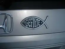 "Gefilte fish" on a car, a humoristic parody of the fish symbol