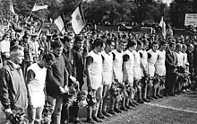 The football clubs would be able to establish structured programs for the development of young talented players in special training centers and sports schools.[7] Training centers (TZ) would eventually form the basis of the East German selection and screening system in competitive sports.[17][18] They were the first preparatory stage for the support of children found suitable for sports. Training in training centers (TZ) usually started at the age of 10.[19] The training course usually lasted for three to four years.[19] From the training centers, the best young talents could then be delegated to a Children and Youth Sports Schools (German: Kinder- und Jugendsportschule, KJS) and a Sports club (SC) or a football club (FC).[20][17][21] The DFV would gradually build 196 training centers (TZ) based on guidelines from the DTSB across East Germany from the beginning of the 1970s.[22] Young talented players from the age of 13 started to be enrolled into elite Children and Youth Sports Schools (KJS) at the same time.[23]