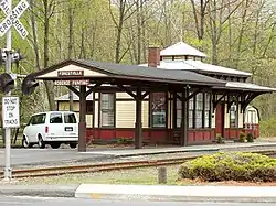Forestville station is located in the heart of Forestville village, on the west side of Central Street, between the former railroad right-of-way it served and the Pequabuck River. It is a small single-story wood frame structure, with a bracketed cornice and a hipped roof topped by a louvered cupola with finial. A platform shelter extends east from the station, supported by square posts with angle brackets. The building originally had a two-story tower, which was lost to fire in 1900. Its footprint is now occupied by a slightly projecting section that historically acted as a vestibule.[2]