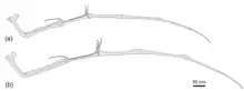 In the shoulder girdle, a number of characteristics contributed to a unique combination of features: a pointed projection on the sternum known as the cristospine was long; the location where the coracoids attached to the sternum, located on either side of a midline ridge on the cristospine, was further forward on the right side than the left; and the coracoid bears a weakly-developed flange (also known in Beipiaopterus, Gegepterus, and Elanodactylus, although also variably present in the Azhdarchoidea[3]). HM V20 in particular was the first archaeopterodactyloid specimen that preserved the articulation of the sternum with the coracoid. Like Beipiaopterus, Elanodactylus, and Zhenyuanopterus, the scapula was longer than the coracoid. Unlike Gegepterus, the back of the sternum was curved in Forfexopterus.[1]