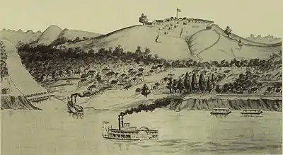 William Tecumseh Sherman was concerned with the Confederate positions in Bowling Green and Columbus, and sent the 37th Indiana and the 9th Michigan regiments to West Point.[2] The plan was to use West Point as a Union supply base for Elizabethtown.[3] Sherman ordered the fort to be built on Pearman Hill to protect the town and supply route.[4] Construction began on November 3, 1861, and was finished in two months. The fort was named for the Rev. George Duffield of Detroit, whose son, Colonel William W. Duffield, led the 9th Michigan Infantry. There were 950 troops stationed there, but they were soon sent to the front lines and the fort was mostly unused in 1862, seeing its last use that fall.