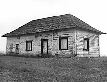 The fort's storehouse is a rectangular one and a half storey building with a hipped roof.[20] The storehouse is the only remaining structure that dates back to the original fur trading fort.[20] It was rebuilt in the 1840s after a fire which destroyed a similar building in 1839, and was the only building which survived the demise of the Fort as an active trading post. The Mavis family, who later purchased the land, used it as a barn for a number of years, until Fort Langley was recognized as a site of historic significance in 1923.