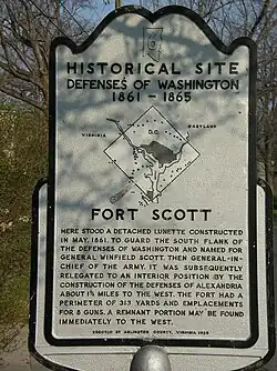 Fort Scott was a detached lunette constructed in May 1861 to guard the south flank of the defenses of Washington during the American Civil War. It was named for General Winfield Scott, who was then General-in-Chief of the Union Army. An historic marker[1] and a small remnant of the fort are the only evidence of the site of the fort on the grounds of what is now Fort Scott Park in Arlington County, Virginia.